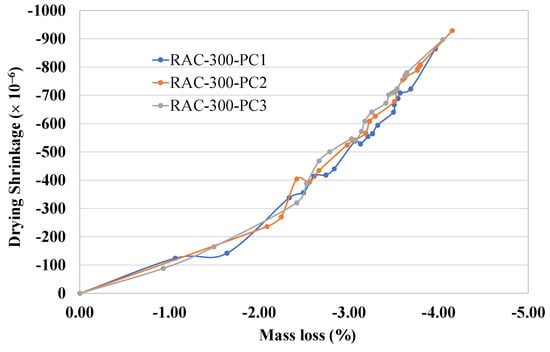 The relationship between the mass loss % and shrinkage value of concrete mixtures of the three concrete mixtures was similar. The three concretes achieved similar total shrinkage and total mass loss (%) values (see Figure 11).