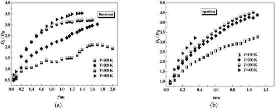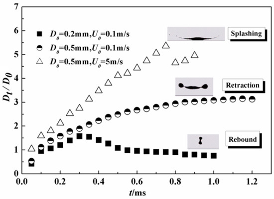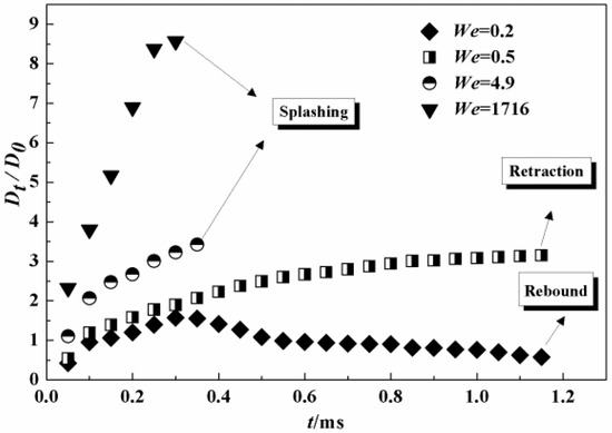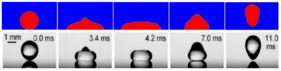 - Scheller, B.L.; Bousfield, D.W. Newtonian drop impact with a solid surface. AIChE J. 1995, 41, 1357–1367. [Google Scholar] [CrossRef]