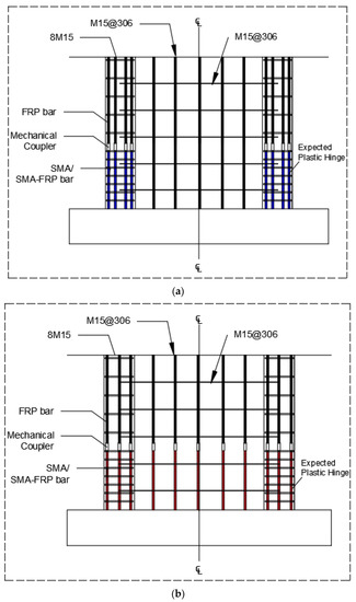 The steel RC wall design was then revised by replacing the steel bars with SMA bars or composite bars, and FRP bars. The SMA bars and the composite bars were utilized over the length of the expected plastic hinges. Mechanical couplers are assumed to connect the SMA bars and composite bars to the FRP bars, which are reinforcing the remaining portion of the wall height. The designed wall is expected to develop two plastic hinges [20] each with a length of 0.2 . One of the plastic hinges is located at the base of the wall due to the predominant vibration mode. The second is at the wall mid-height as a results of higher vibration modes.