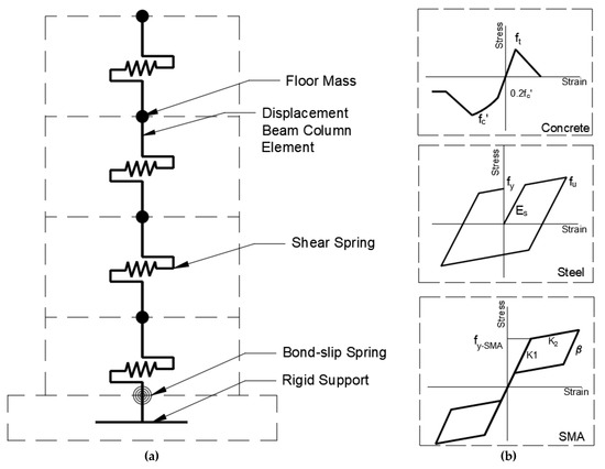 Numerical model. (a) displacement beam-column model; (b) material models.