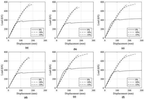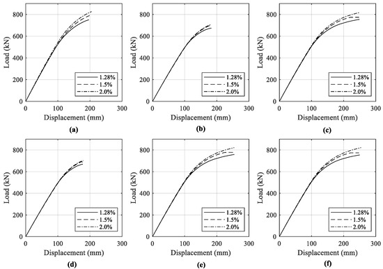 Effect of web reinforcement ratio: (a) W1; (b) W2; (c) W3; (d) W4; (e) W5; (f) W6.