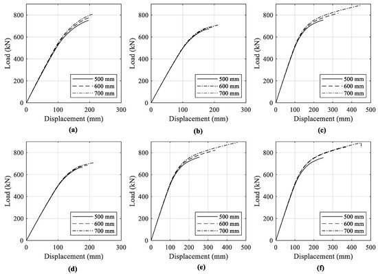 The effect of increasing the length of the wall boundary on the load-displacement behavior is shown in Figure 7. For W1, increasing the boundary element length from 500 mm to 700 mm slightly increases the load capacity and the lateral displacement capacity. The displacement increase was more visible for SMA RC walls (W2 and W4) as the load capacity and lateral displacement capacity of SMA RC walls (W2 and W4) increased by 3% and 20%, respectively. For composite RC walls (W3, W5, and W6), the increase was significant, reaching 17% and 68% for the load capacity and lateral displacement capacity, respectively.