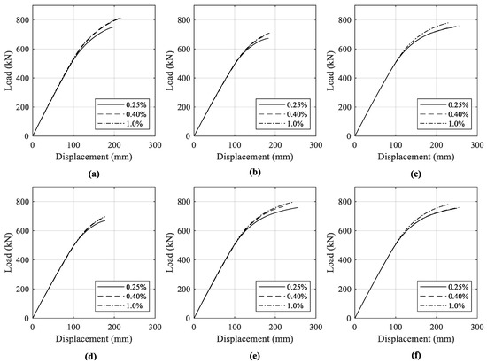 Figure 9 shows the effect of web reinforcement on the load-displacement curves for the studied walls. Increasing the web reinforcement from 0.25% to 0.40% for wall W1 increased the load capacity by 8% and slightly increased the displacement capacity. In contrast, W2, W3, W4, W5, and W6 showed an increase in load-capacity by about 4%, accompanied by a decrease in the displacement capacity by about 5%. The effect of increasing the web reinforcement ratio on load and displacement capacity was found to be negligible beyond 0.4%.
