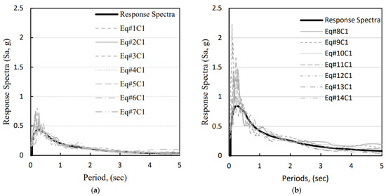 Eigenvalue analysis was performed for each of the considered walls. The minimum (T1S) and maximum (T1) fundamental periods were 1.69 and 1.71 seconds, respectively. Seven ground motions were selected to represent the seismic hazard spectrum of Vancouver, BC, considering 2% [25] and 10% (moderate) probabilities of exceedance in 50 years (2% in 50 y and 10% in 50 y). The ground motions were selected from the PEER ground motion database to have an effective vibration period that ranged between 0.2 T1S and 1.5 T1 as per TBI (2017) and to match the assumed site class. The ground motions were then scaled using the Mean Square Error (MSE) to minimize the difference between the response spectra of their strong components and the target spectra. The resulting response spectra for the strong components of the earthquakes are shown in Figure 10, where Sa is the spectral acceleration. Details of the selected ground motions and the used scale factors are listed in Table 5.