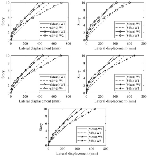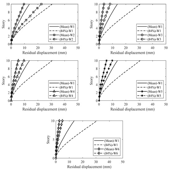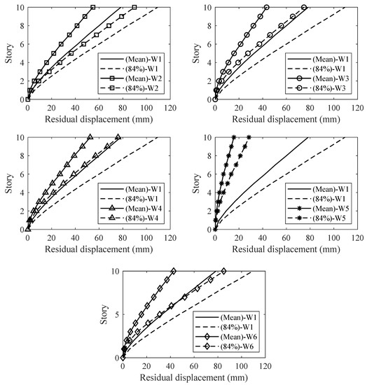 Figure 11, Figure 12, Figure 13 and Figure 14 show the mean and 84th percentile maximum and residual lateral story displacements of the examined walls. Table 6 summarizes the maximum interstory drift (MID) and maximum residual interstory drift (MRID) values.