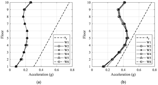 Figure 15 shows the variation of the floor acceleration for the considered walls. All walls had similar acceleration values. This behavior might be explained by their similar natural periods, which are located in the displacement region of the response spectra of the chosen records. For the 2% in 50 y seismic events, the peak floor acceleration is increased by about 90% as compared to the 10% in 50 y seismic events. The damage to non-structural components for all considered walls is acceptable as the floor accelerations are lower than the allowable limits.