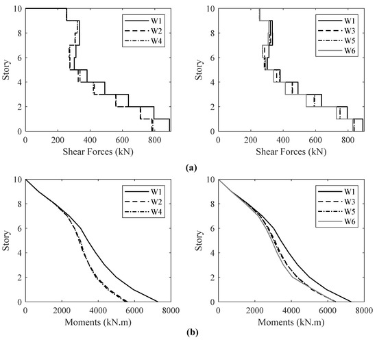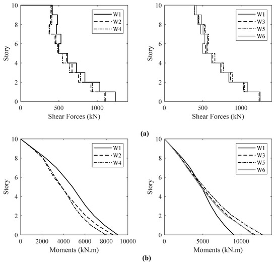Figure 16 shows the shear forces and bending moment envelopes for the 10% in 50 y seismic events. The mean story shear for W1 is about 10% higher than that of SMA and composite RC walls. The reduction in story shear forces corresponds to a decrease in the bending moments, reaching 17%. Figure 17 shows the shear forces and bending moments for the 2% in 50 y seismic events. Shear forces and bending moments for SMA RC walls (W2 and W4) are lower than W1 by about 11% and 24%, respectively. For composite RC walls, the difference in the story shear forces was negligible, but their moments were higher than W1 by 35% on average.