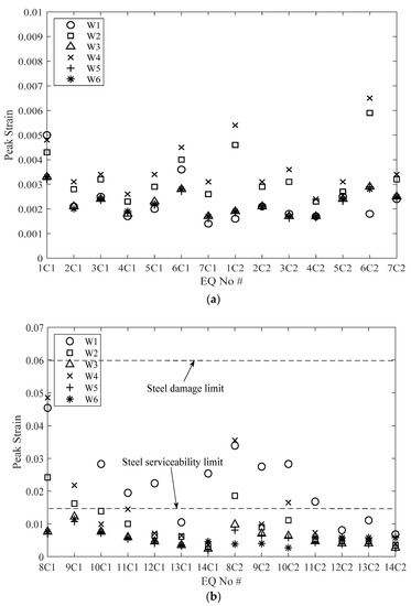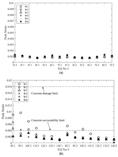 Figure 18 and Figure 19 show the maximum developed strains in the rebars and concrete. For the 10% in 50 y seismic events, strains in the concrete, steel bars, SMA bars, and composite bars were lower than their serviceability limits. For the 2% in 50 y seismic events, the strains in the SMA and composite bars remained below their serviceability limits. However, the strains in the steel bars of W1 reached 0.055, which exceeds their serviceability limit. The concrete strains of W1, W2, and W4 also exceeded the concrete serviceability limit. Strains developed in W3, W5, and W6 reflect a minor amount of damage for the two considered seismic hazards.