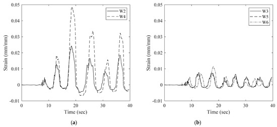 Figure 11 shows that the differences in the maximum lateral story displacement between W1, W2, W4, and W6 are negligible for the frequent 10% in 50 y seismic events. For the same hazard level, the maximum lateral story displacements of composite RC W3 and W5 are on average 11% less than for other walls. Considering the 2% in 50 y seismic events, Figure 12 shows that the low modulus of elasticity of SMA and composite bars leads to 10% to 31% higher maximum lateral story displacements for walls W2 to W6, as compared to W1.