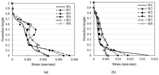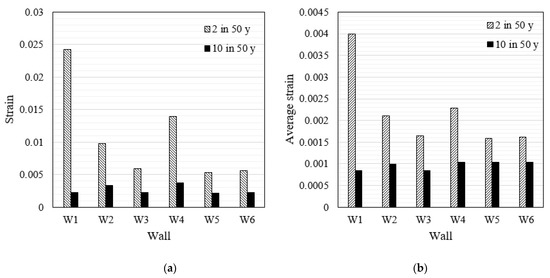 Distribution of average reinforcement strains along the height. (a) 10% in 50 y; (b) 2% in 50 y.
