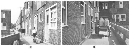 Spangen Quarter, Rotterdam—an open gallery access conceived as a pedestrian street for various activities: (a) Source: https://www.deoudrotterdammer.nl/archief/dor/2012/week38_jaargang8/files/assets/basic-html/page15.html (accessed on 25 September 2021); (b) Source: http://besems.eu/2017/12/10/justus-van-effen-kwartier-rotterdam/ (accessed on 25 September 2021).