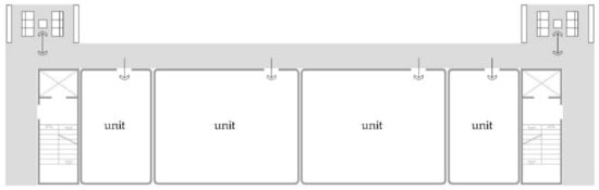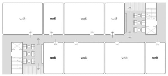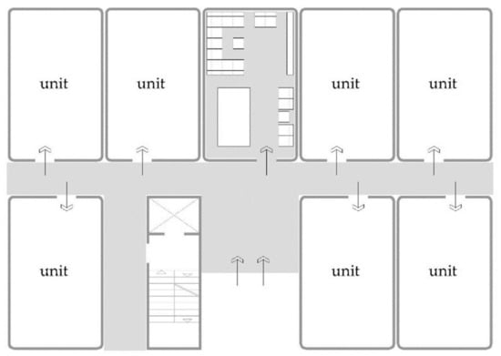 Since a corridor, as a type of access to multiple apartments per floor, usually has no natural lighting, there are generally no additional activities in it and its purpose is reduced to the basic one—circulation. By omitting certain housing units or their parts along the corridor, spaces with natural light, suitable for gathering, socializing and talking among the residents, emerge (Figure 5). They can be closed or open and can also run through multiple floors. Moreover, by inserting lightwells along the corridor throughout the entire height of the building, it is possible for natural light to penetrate the corridor, thus increasing the social component of the circulation space.