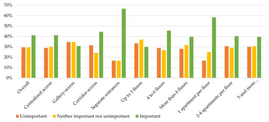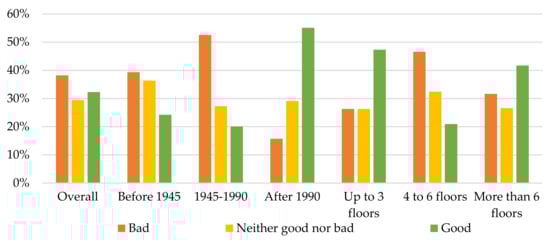 In terms of the number of floors in the building, the highest marks (47.36%) were given by the occupants of buildings with up to three floors; it is logical that, in buildings with a smaller number of floors (and therefore smaller number of users), circulation spaces are in better condition than in buildings with more floors, i.e., more users. However, the lowest grades (20.94%) were given by the residents of buildings with four to six floors (Figure 11). The reason for this lies in the fact that a large number of buildings in this category are without elevators, and that occupants use stairs and hallways to a greater extent than is the case in buildings with elevators; due to use by a large number of residents, these spaces may be in poorer condition. Furthermore, if more encounters take place, residents cannot maintain a physical distance and therefore such a space is perceived as cramped.