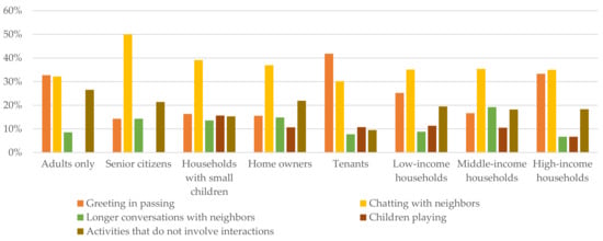 The grouping of residents in a multifamily apartment building (MFAB) is without any specific connections, and the spatial proximity will not itself guarantee their sociological closeness [1,2]. With the increase in the total number of residents, the possibility for the neighbors to know each other decreases and the feeling of belonging to a certain social group weakens. Thus, multifamily housing is often characterized by weaker social relationships [3,4] and a lack of socializing among the residents [5].