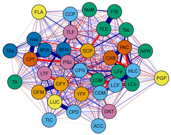 Correlation analysis of different variables that make up each capital that contributes to the well-being of coffee households in southern Colombia. The color of each circle signifies each capital. The thickness of the line between the circles signifies the level of correlation. Blue and red signify positive and negative correlation, respectively. (the acronyms of each variable are found in Table 1).