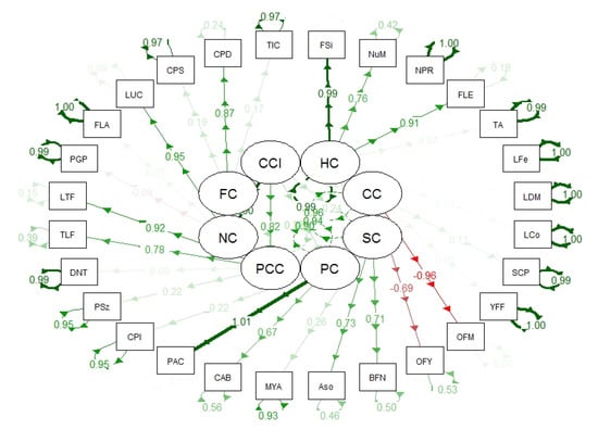 Structural equation model fit evaluation criteria were adopted, such as maximum likelihood χ2 values, goodness-of-fit index (GFI) and root mean square error of approximation (RMSEA) []. RMSEA values <0.10 suggest an accepted model fit and the lowest RMSEA value indicates the best fit, and in the GFI, the cutoff criterion ≥0.90 indicates a good fit []. The 95% confidence intervals were used to decide whether the estimated parameters differed from zero. According to the conventional null hypothesis test, if the confidence interval did not include zero, the estimated parameters could be considered significant. Models were fitted with the cfa function of the sem package [] of the R language version 4.0.4 []. Visualization of the fitted models was performed using the semPaths function of the semPlot package []. The R software was run in the InfoStat statistical software interface [].