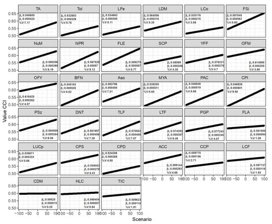 In the third stage, a sensitivity analysis [] was carried out with each of the variables to determine and identify the most sensitive variables of each capital on the well-being of coffee families measured through the CCI. Based on the current conditions found for each of the variables in coffee families, scenarios of 100% reduction and increase of these variables and their impact on the CCI were simulated. With the different scenarios, the percentage increase of the CCI and its sensitivity to different capital variables were calculated by evaluating the slope of a linear regression model.