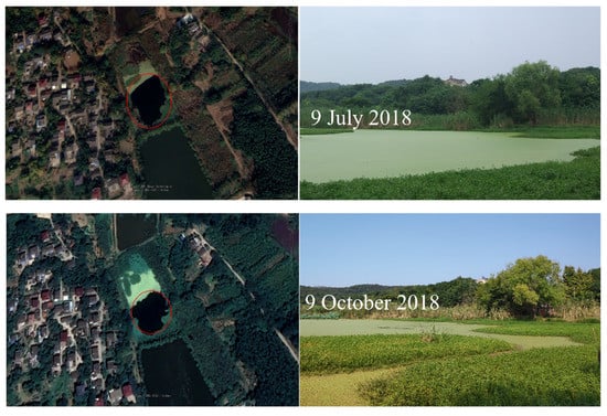 Spread of Alternanthera philoxeroides Griseb in eutrophic wetland. Photos were taken in a eutrophic pool invaded by A. philoxeroides Griseb next to Huilong reservoir, Zhenjiang City, Jiangsu Province, China (119°45′ E; 32°15′ N) in 2018. These pictures show spread of A. philoxeroides Griseb over 3 months (9 July to 9 October 2018).