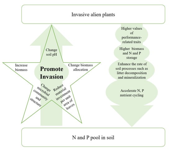 Therefore, instead of plant invasions influencing N and P enrichment (Table 1), N and P enrichment may exacerbate plant invasion. We suggest that linking abiotic factors, such as N and P concentration, is critical to identify how and why alien species successfully expand and invade. This study synthesizes the available knowledge and information on the interaction processes and mechanisms between invasive alien plants and N and P in order to provide a better understanding of ecosystem functioning. In particular, this review establishes interaction mechanisms between invasive alien plants and nutrients (mainly N and P) in the context of ecosystem functioning.