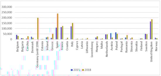 The top five destination countries in 2015 and 2018 are Germany, the United Kingdom, Italy, France, and Spain (see Figure 1, where the value for Germany in 2015 (677,381) was omitted from the chart, being an outlier).