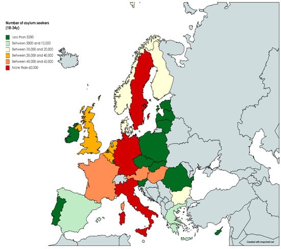 As the asylum seekers are young persons (78.7% of asylum seekers in EU in 2020 were less than 35 years old and those in the age range 18–34 years were about 47.7% of all asylum seekers), we will concentrate on asylum seekers in the age range 18–34 years (as they choose their destination, usually the younger migrants follow their parents) and we found that the evolution follows the general trend. The peak was reached in 2015, when the application of the young immigrants represented about 53 percent of the total asylum applications. A third of them were reported in Germany, followed by Hungary (15%), Italy, and Sweden (each around 10%). About half of them are found in three countries, namely Germany, Italy, and Sweden. Hungary is found on the Syrian refugees’ path, but it is considered a transit country. As shown in Figure 2, significant variations in the numbers of young asylum seekers are found in the EU-28 countries and Norway.