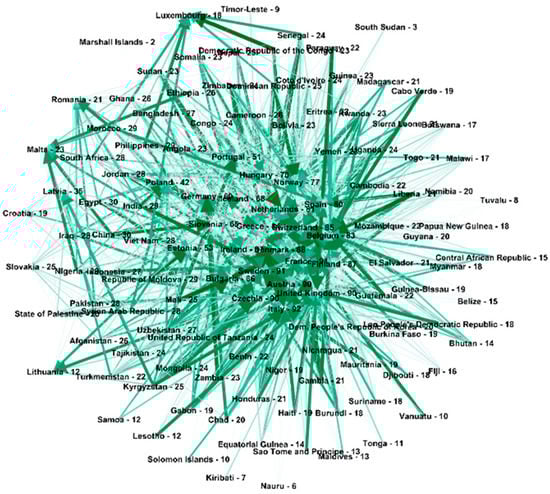 The network of estimated immigrant stock whose countries of origins are with low or medium HDI living in 2019 in considered countries. Source: own processing based on UN Data. Retrieved data from: https://www.un.org/en/development/desa/population/migration/data/estimates2/estimates19.asp (accessed on 13 July 2021).