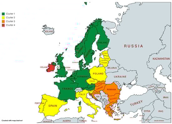 The results of the cluster analysis with four clusters provided the most promising and reliable results (as cluster analysis is a high-level descriptive method and it is an explorative analysis) for both 2015 and 2018. For the year 2018, the country distribution by clusters may be visualized in the following figure (Figure 4).