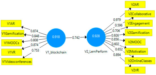 The mean extracted variance (AVE) of each latent variable: (a) V1Blockchain (0.624); (b) V2LernPerform (0.703) was higher than the acceptable threshold of 0.5, so the convergent validity was confirmed. Moreover, the correlation coefficient R square was higher than the minimum accepted 0.5. The inner model was statistically significant because its standardized track coefficient (0.742) had a high value. The Collinearity Statistics (VIF) shows that there is no multicollinearity between our independent variables (Figure 2). If between independent variables manifests multicollinearity then the statistical inferences will be less accuracy, due to higher standard errors. VIF value 1 means that variables are not correlated VIF values between 1 and 5 means that variables are moderately correlated and VIF values greater than 5 means that variables are highly correlated.