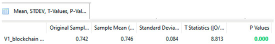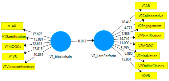 The two-tailed t-test in bootstrapping values was all higher than 1.96. In other words, the values were higher at the critical level, which means they were significant [62]. p Values were smaller than 0.01. Even the path coefficient (8.813) had a very high value. All these criteria allow us to assume that our hypothesis was accepted. Thus, we may assume that blockchain technology facilitates learning performance in a very high proportion (Figure 5).