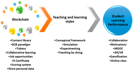 Students’ learning performance depends on collaborative work, student motivation, engagement, and blockchain tools such as MOOCs, AR, VR, online courses, and gamification. In summary, blockchain can support learning performance by bringing people together and promoting knowledge sharing, increasing it.