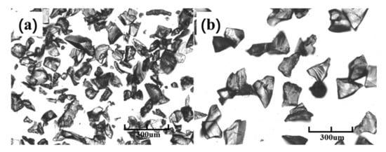 Microscope image of (a) #1 and (b) #2 hydrogel extinguishant powders.