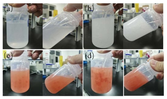 Different concentrations of hydrogel sample dispersion status: (a) 0.5% and (b) 1.0% concentration of hydrogel extinguishant solution #1; (c) 0.5% and (d) 1.0% concentration of hydrogel extinguishant solution #2.