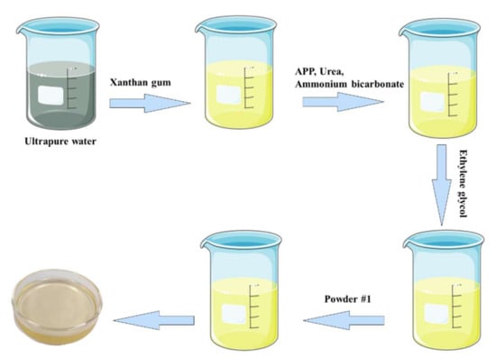 Based on the results in Section 3.2, the improvement of individual property for extinguishants might have a negative impact on its nature. More importantly, it has been reported that the ratio of different additives also has a significant effect on the performance of extinguishants [27]. Therefore, extinguishant #1 was modified to balance each performance. The order of different additives added into the solution was shown in Figure 4. Firstly, a certain amount of xanthan gum, then APP, urea and ammonium bicarbonate, ethylene glycol. Finally, powder #1 was combined with the solution. To further optimize the amounts of various additives, single-factor experiments with ten groups were designed, and the results are listed in Table 3.