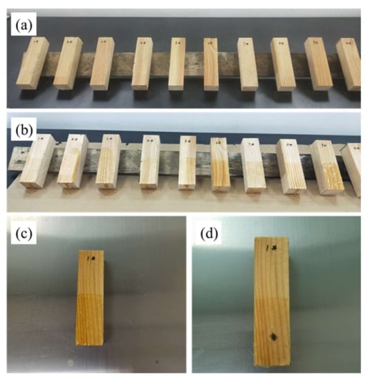 (a) Original wood strips and (b) wood strips after adhesion test. (c) Wood strip at the beginning of the flame retardant test and (d) state of wood strip after completion of flame retardant test.