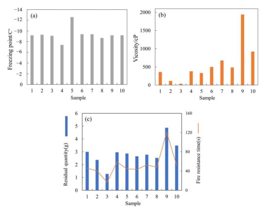 Comparison of the 10 samples of modified hydrogel extinguishant solutions: (a) freezing point; (b) viscosity; (c) adhesion mass and flame retardance time on wood strips.