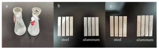 The storage and transportation equipment of the extinguishants are mainly com-posed of metals. It is known that some additives may cause corrosion in storage and delivery devices. Hence, corrosion is an important index for evaluating the safety performance of extinguishants. In this study, the safety test referred to the national standard (GB 15308) was conducted [31]. Four pieces of steel sheet (Q235 steel) and aluminum sheet (LF21 aluminum) were chosen and weighed. After removing the oxide film, the surface area was calculated. Then, the metal sheets were placed into two conical flasks containing the modified No. 9 solution and the original 1# hydrogel extinguishant solution, as shown in Figure 7a,b. The conical flasks were placed in a drying oven for 21 days. The mass of each metal sheet was weighed after removing the surface corrosion products. The degree of corrosion was calculated according to the formula in Equation (3):