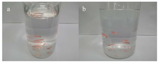 The state of zebrafish after 96 h in (a) hydrogel solution #1 (0.5%) and (b) No. 9 hydrogel solution.