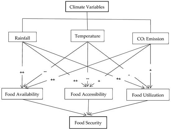 2 emission) on food security as a whole through three of its indicators (food availability, accessibility, and utilization). The results acquiescently show a statistically significant and positive long-run relationship between rainfall and food availability and between CO
