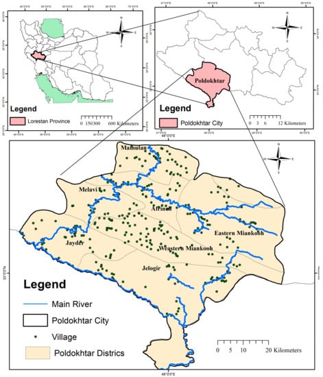 The study region, Pol-e Dokhtar, is located in the south of Lorestan Province, Iran. This region has a total population of 73,744, about 53.5% of whom live in rural areas. The district lies between longitudes 47°027′ W and 48°022′ W and latitudes 32°041’ N and 33°031´ N with an estimated area of about 3615 km2 (Figure 1). Due to being located in the outskirts of Lorestan province and near the Kashkan River, Pol-e Dokhtar is one of the most vulnerable regions to flooding. The Kashkan River basin is one of the critical sub-basins of the Karkheh catchment located in the middle part of the Zagros Mountains, with more than 9000 km2. With its entire catchment being located in Lorestan, the main branch of this river accounts for more than 30% of the province’s total area. The latest floods in the Kashkan River basin occurred in 2019. Heavy rains caused water levels to rise rapidly. In April 2019, the floods were exceptional in time and spatial distribution in the Kashkan basin. The Kashan River has experienced a water flow of over 5000 cubic meters per second at Pol-e Dokhtar Station. The climate of the district is warm and semi-arid. The mean annual rainfall of the region is between 450 and 650 mm, whereas the temperature ranges between 0 °C at night during the cold season and 48 °C during the day in the hot season. Pol-e Dokhtar County is divided into two administrative zones (Central and Mamolan) and seven districts, including Jaider, Jelogir, Melavi, Western Miankouh, Mamolan, Afrineh, and Eastern Miankouh. This county has 322 villages distributed in the seven districts mentioned above. Agriculture is the most common economic activity in this area, accounting for 80% of the jobs. Agriculture is small-scale, comprising crops (e.g., wheat, barley, maize, rice, beans, black fig, tomatoes, cucumbers and figs, and different vegetables), and animal husbandry (sheep, goats, cattle, and poultry).