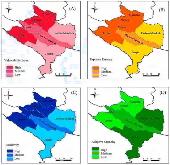 (A) Vulnerability indices over the rural districts of Pol-e Dokhtar; (B) exposure indices; (C) sensitivity indices; (D) adaptive capacity.