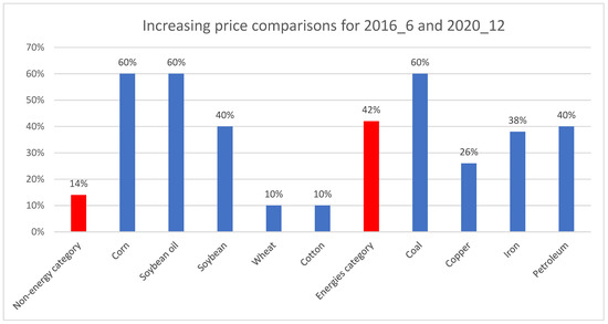 In June 2021, the mid-price international bulk commodity price index (December 2013 = 100) of the Price Monitoring and Compilation Center of the National Development and Reform Commission increased by 32% from December 2020 [10]. Figure 1 shows that the energy price index represented by observations rose by 42%, and the non-category prices represented by soybean, wheat, corn energy, and cotton rose by 14%. Specifically, the prices of soybean oil, coal, and coal rose by more than 60%. The prices of products have risen dramatically since December 2020. As a result of the coronavirus pandemic in 2020, the current increase in commodity prices is mainly driven by market expectations [11]. On the one hand, the global economic recovery has brought about expectations of growth in commodity demand; on the other hand, the “uncapped” quantitative easing policy in the United States has spawned market concerns about excess liquidity, and the combined effect of the two has greatly increased the market’s expectations for later price increases. In addition, the short-term increase in the price of bulk commodities is due to the substitution of goods consumption for service consumption caused by the epidemic, as well as the suppression of the supply of basic commodities by the epidemic and the disturbance of the supply chain. In the long term, it may be affected by continuous supply contraction and the global carbon emission reduction wave. In addition, the imported inflation risk brought by the rapid increase in commodity prices this round is generally controllable. However, some issues, such as structural adjustment pressure caused by price increases, the risk of declining benefits, and the increase in uncertainty in the foreign trade situation, should be paid attention to [12].