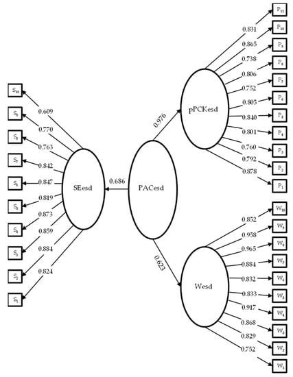 The results of the second-order CFA measurement model are reported in Figure 1. A factor structure consisting of a second-order latent construct (PACesd) composed by three first-order constructs (Wesd, pPCKesd and SEesd) was confirmed with model fit indices indicating an adequate model fit (RMSEA = 0.077; CFI = 0.964; TLI = 0.961). Moreover, the adequate model fit was also supported by the results obtained for the parameter estimates such as factor and item loadings (Figure 1). All these parameters are statistically significant at p < 0.001. Item loadings ranging from 0.609 to 0.965 indicate that the 31 items are strong indicators of their corresponding first-order factors (SEesd, pPCKesd, Wesd). Moreover, in line with the literature, factor loadings indicate that SEesd (0.686), pPCKesd (0.976) and Wesd (0.623) are good indicators of the second-order factor (PACesd). We therefore retained the second-order measurement model of PACesd for further analysis.