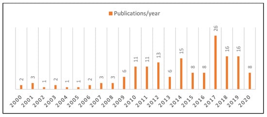 Publications at an international level about human rights related to mining and the environment per year (162). Consulted in Scopus on 21 July 2020.