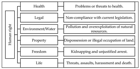 Several rights violations may appear in SECs to those who participate in the resistance movement [33]. The violence in SEC is proof of the tension between extractivism and HR, as are socio-environmental protests and the assassinations of environmental activists. In Mexico, 117 homicides of ecological activists were registered from 2010 to 2018 [14,15].