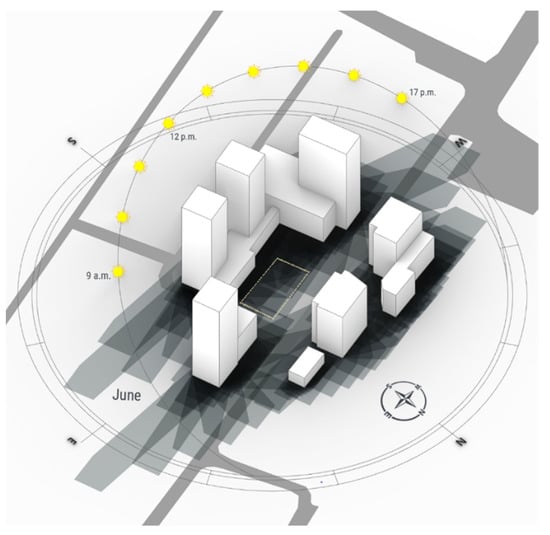Several Warsaw locations were initially chosen for this study. They had to fulfill specific parameters: location in the city center, dense and highly shaded developed site, the existence of a valid master plan allowing to build above 100 m in height, and the possibility for retail and office function. The best location proved to be a plot in the Wola District located at 59 Grzybowska Street (G59). It had the lowest daylighting parameters among the analyzed plots. Accordingly, a preliminary radiation analysis of the site was performed. The simulation was conducted for 21 June when the sun is at its apex. The shadows were the shortest on that day, and the shading results indicated shadowing throughout the year. (Figure 1).