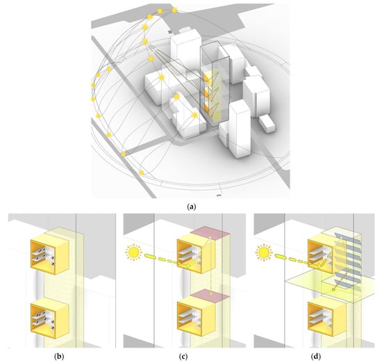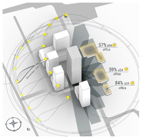 Figure 4. shows that blocks A, B, and C require the enhancement of daylight parameters. This conclusion refers to the LEED and BREEAM daylight regulations, stating that the "preferred" value of daylight starts with 75% of the area and should be in the range of 300–1000 lx during at least half of the year. Atrium efficiency analysis proved that the zenith light source is sufficient only for the topmost block, whereas the central part of the south facade was suitable for the placement of the sky-atriums. Hence, a side-light-capturing concept was introduced. The vertical shading analysis is shown in Figure 5a. The assumption was to enhance the light level in 75% of the building’s area. This resulted in a multi-story side terrace proposal, with optimized size and form and a public function (Figure 5b). The primary choice of their dimensions and position was based on an equilibrium between creating a usable social area and minimizing its interference with the incoming light. The wall and ceiling reflective panel data were included in the algorithm input to provide the case with the best vertical and horizontal distribution of light within the building’s interior (Figure 5c,d).