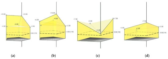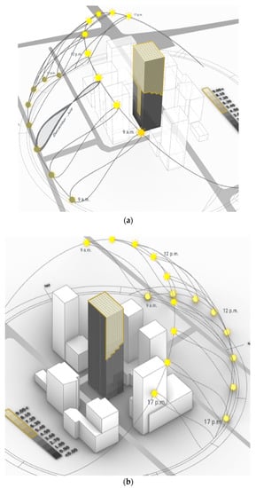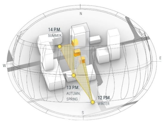 The simulation was conducted for a period from 21 December to 21 June. These positions correspond to the highest and the lowest possible points of the sun in the sky and show the starting and ending points of the shaded zone on the Z-axis (Figure 3). As seen in the diagram, the most illuminated area is the central part of the south facade, starting from the 5th floor of the building. The area below the 5th floor and a major part of the area between the 5th and 20th floors are episodically shaded during the year.