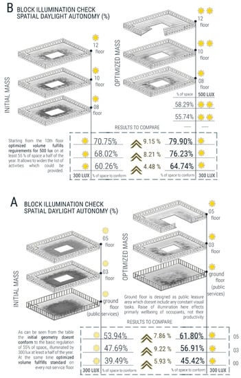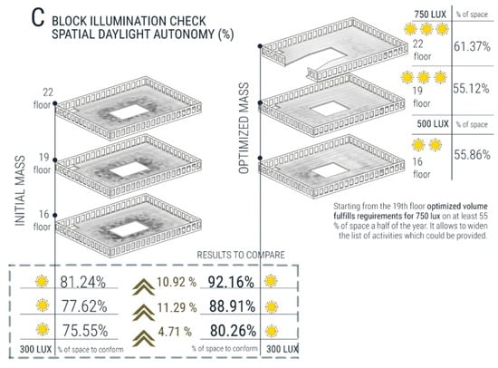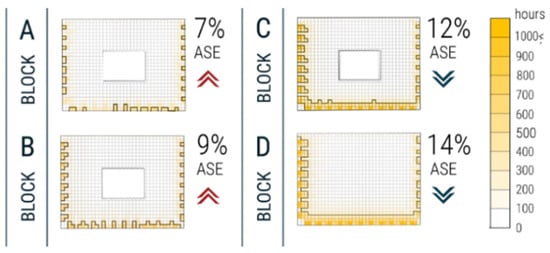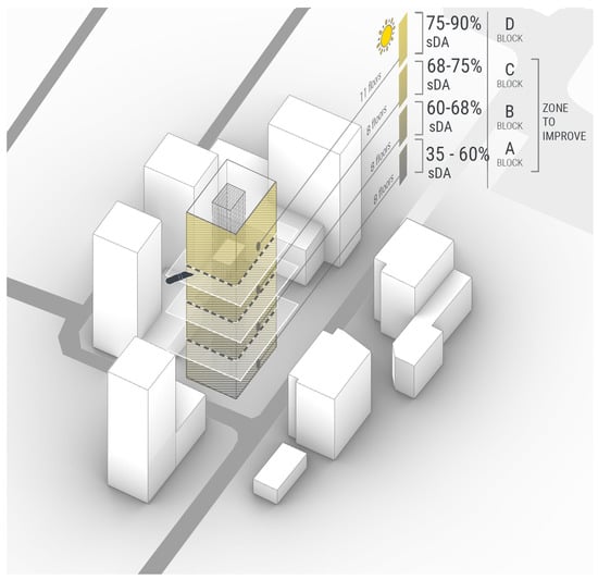 The solution for every facade was analyzed in line with the above assumptions. The outcome was corrected under the foreseen function of each area and the overall architectural and esthetic perception of the facade pattern (Figure 20). Also spatial daylight autonomy (SDA) was analysed for Blocks A-C (Figure 21). The topmost Block D has good daylight parameters from the start, hence it did not undergo SDA.