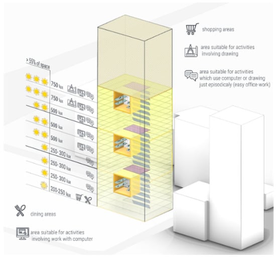 The functional division of each floor was planned to correspond to the final daylight enhancement results. The range of activities was modified according to the achieved daylight levels (Figure 6). Therefore, artificially illuminated underground floors should serve as technical and car parking areas. The most shaded floors in block “A” can be used for public spaces without the benefit of lasting visual activities. Starting from the second floor, where the daylight level was enhanced, the range of functions was greater, although office areas started from the third floor with the lowest atrium. It was assumed that the easy office work area must meet the 300 lx-requirement, those suitable for computer-based activities must meet 500 lx compliance, and an office area involving drawing-based activities requires 750 lx [].