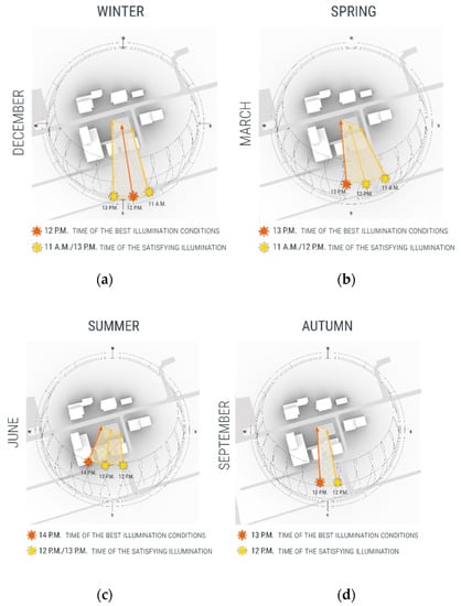 The proposed alternative A solution proved to fulfill expectations, but it lacked architectonic esthetics, and the level of daylight illumination in the office areas was lower than what was initially assumed. To achieve a more diverse and energy-efficient architectural massing, additional daylight studies based on annual illumination and sky clarity conditions were undertaken. Occupancy daily hours’ time range, from 8 a.m. to 5 p.m., was used in the analysis. The results were divided into four groups, representing the months with the solstices and equinox positions of the sun: December, March, June, and September. In Warsaw latitudes (52°05′52″ N–52°22′05″ N; 20°51′06″ E–21°16′16″ E) March is characterized as the month with the highest number of clear sky days, while September is usually described as cloudy (Figure 7).